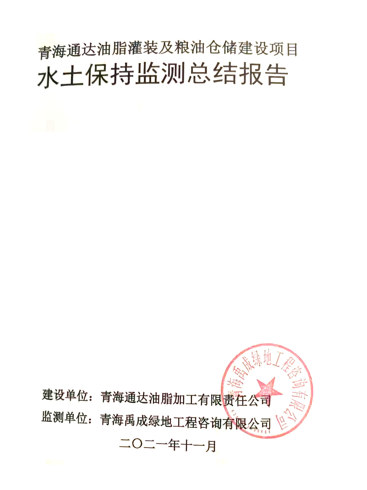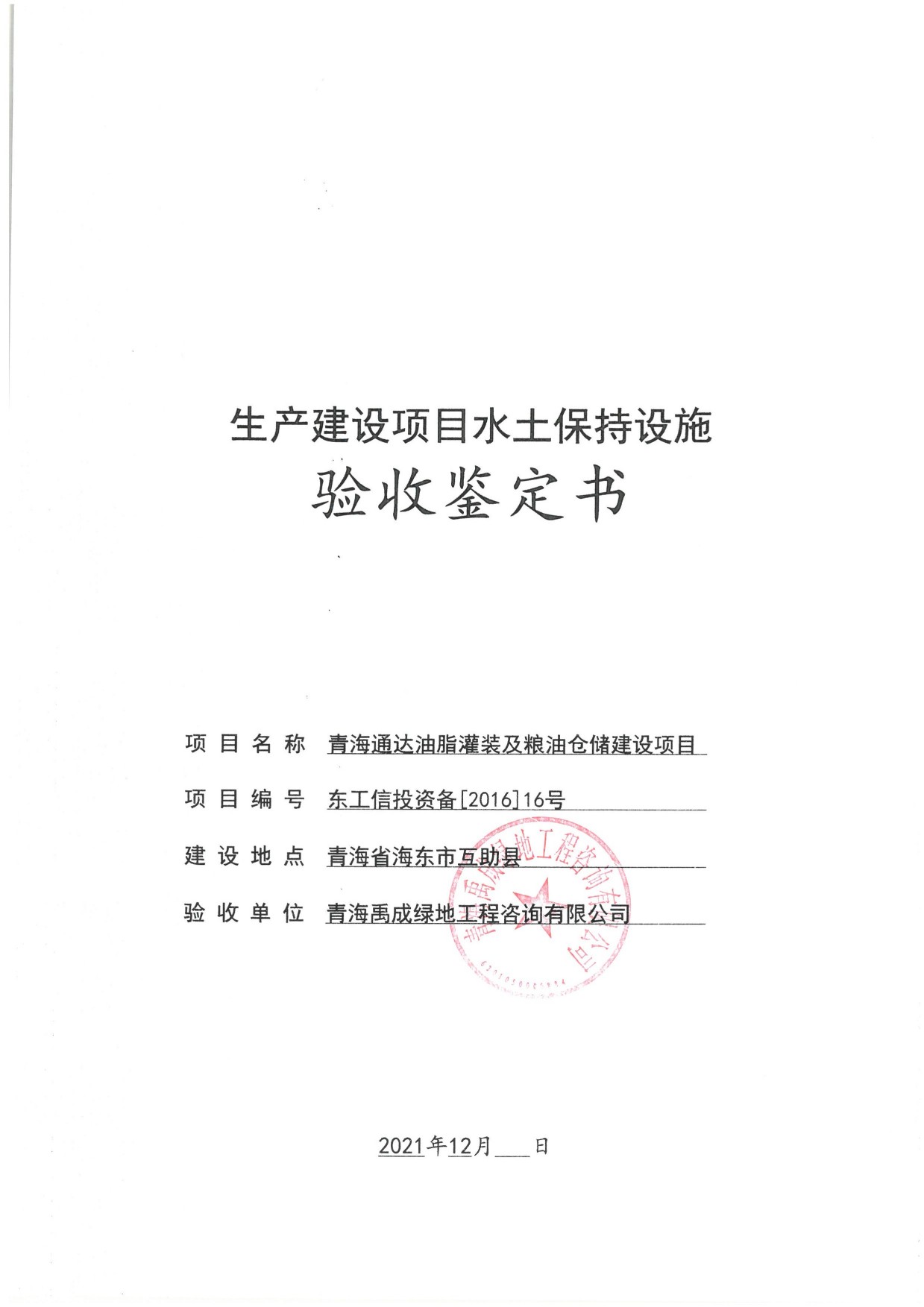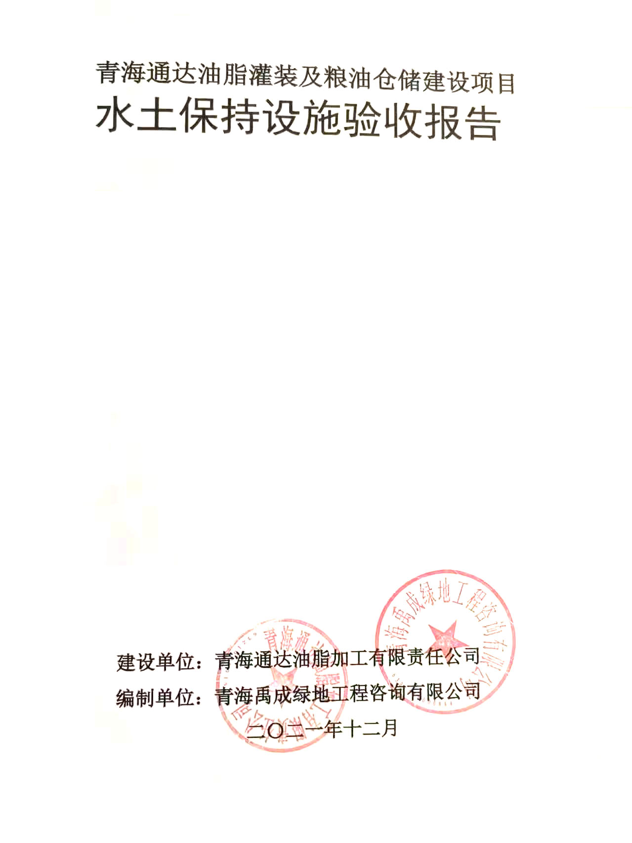 说 明 根据《中华人民共和国水土保持法》和《水利部关于加强事中事后监管规范生产建设项目水土保持设施自主验收的通知》(水保〔2017〕365 号),青海通达油脂加工有限责任公司于 2021年12月10日在公司会议室主持召开了青海通达油脂灌装及粮油仓储建设项目水土保持设施验收会议。
